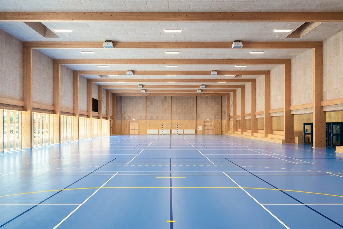 Den nye hal udgøres af to, sammenhængende bygningsvolumener, et stort, længst mod øst, der rummer selve hallen, og et lavere mod vest, der matcher skalaen på den eksisterende skole, og som rummer de lokaler, der har mindre krav til rumhøjde, som fx omklædningsfaciliteter og fitnessrum.